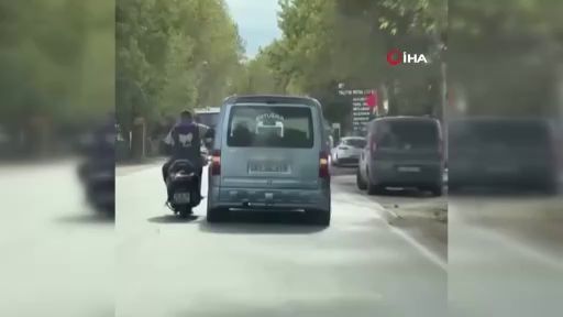 Bursa’da bir motosiklet sürücüsü seyir halindeki arkadaşıyla sohbet etmek için, bir elini seyir halindeki ticari aracın camına yasladı, diğer eliyle de motosikleti kullandı. Sürücülerin tehlikeli hareketleri kameralara yansıdı.