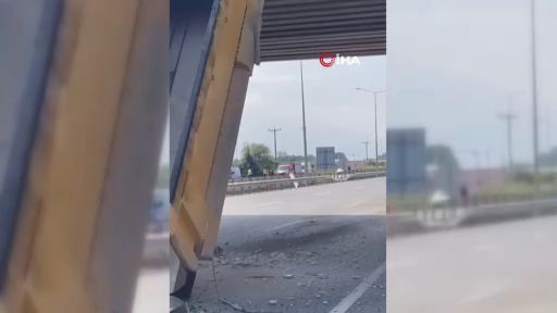 Bursa'nın İnegöl ilçesinde damperinin açık kalması sonucu üst geçide çarpıp şarampole uçan kamyon kazası, saniye saniye kameraya yansıdı.